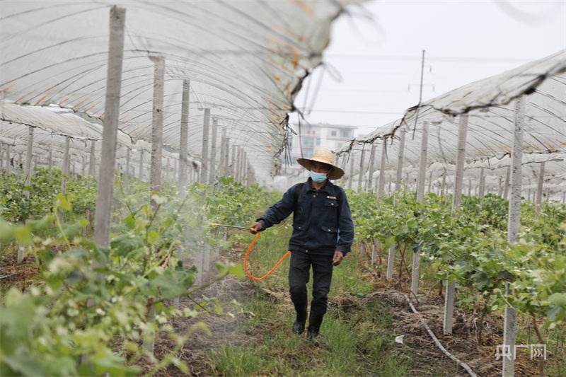 4月19日,记者走进江西省萍乡市莲花县神泉乡五洲村葡萄基地,大棚里,绿油油的葡萄藤爬满了藤架,藤蔓上结满了密密麻麻的小葡萄,村民正在给葡萄摘蔓、梳果、绑枝、打药、施肥。