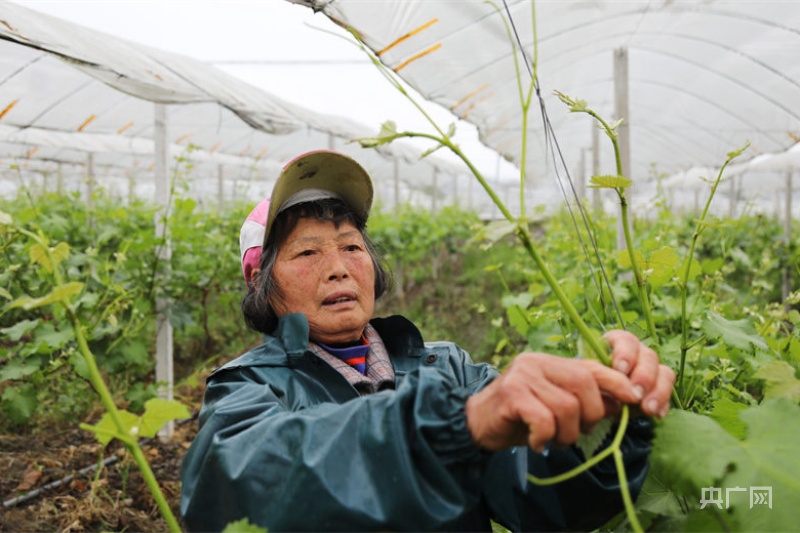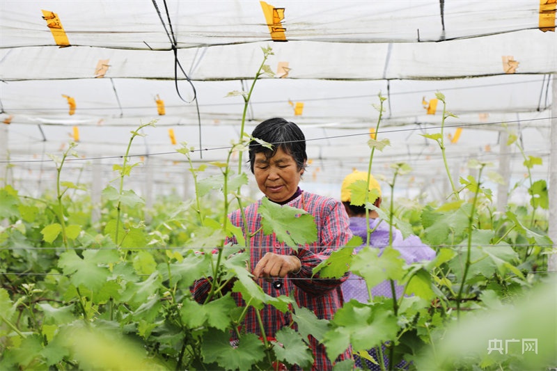4月19日,记者走进江西省萍乡市莲花县神泉乡五洲村葡萄基地,大棚里,绿油油的葡萄藤爬满了藤架,藤蔓上结满了密密麻麻的小葡萄,村民正在给葡萄摘蔓、梳果、绑枝、打药、施肥。